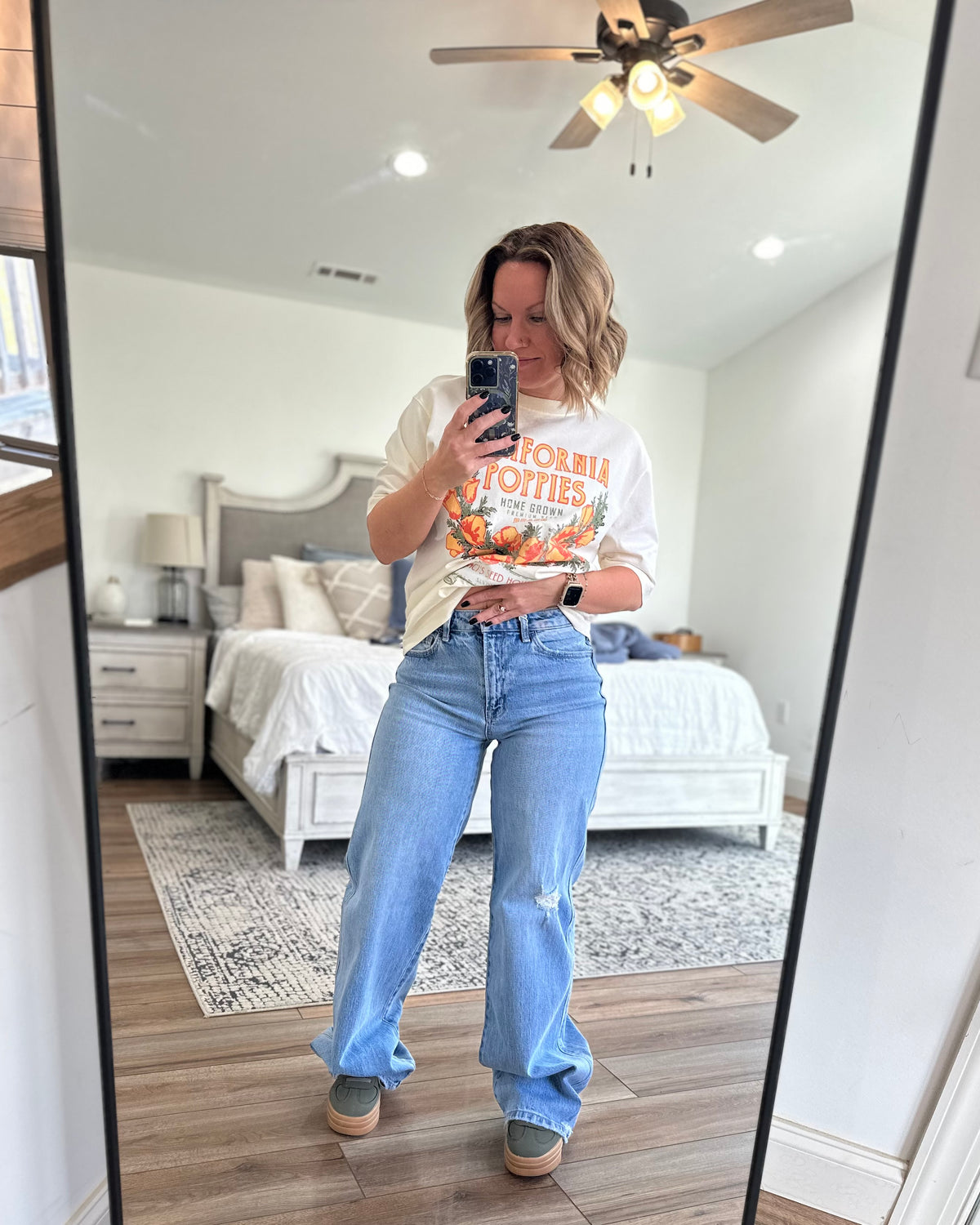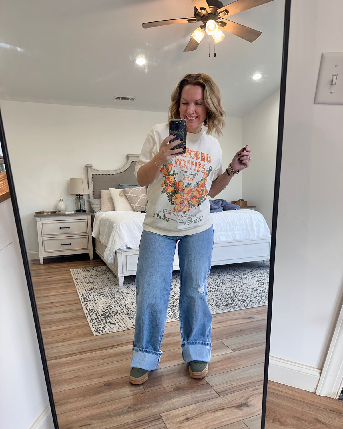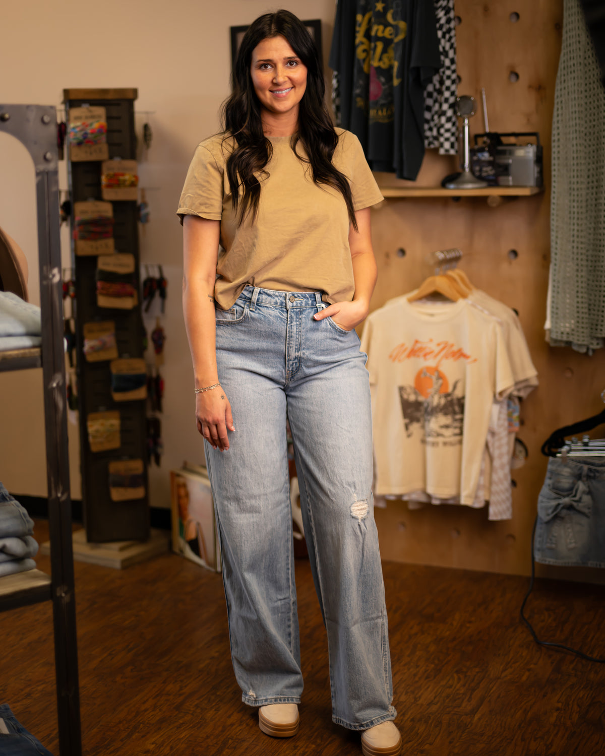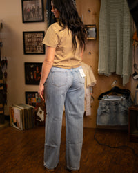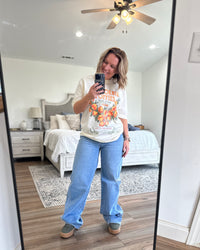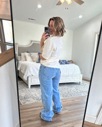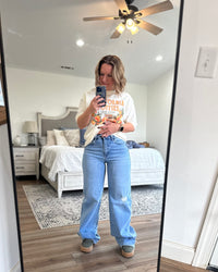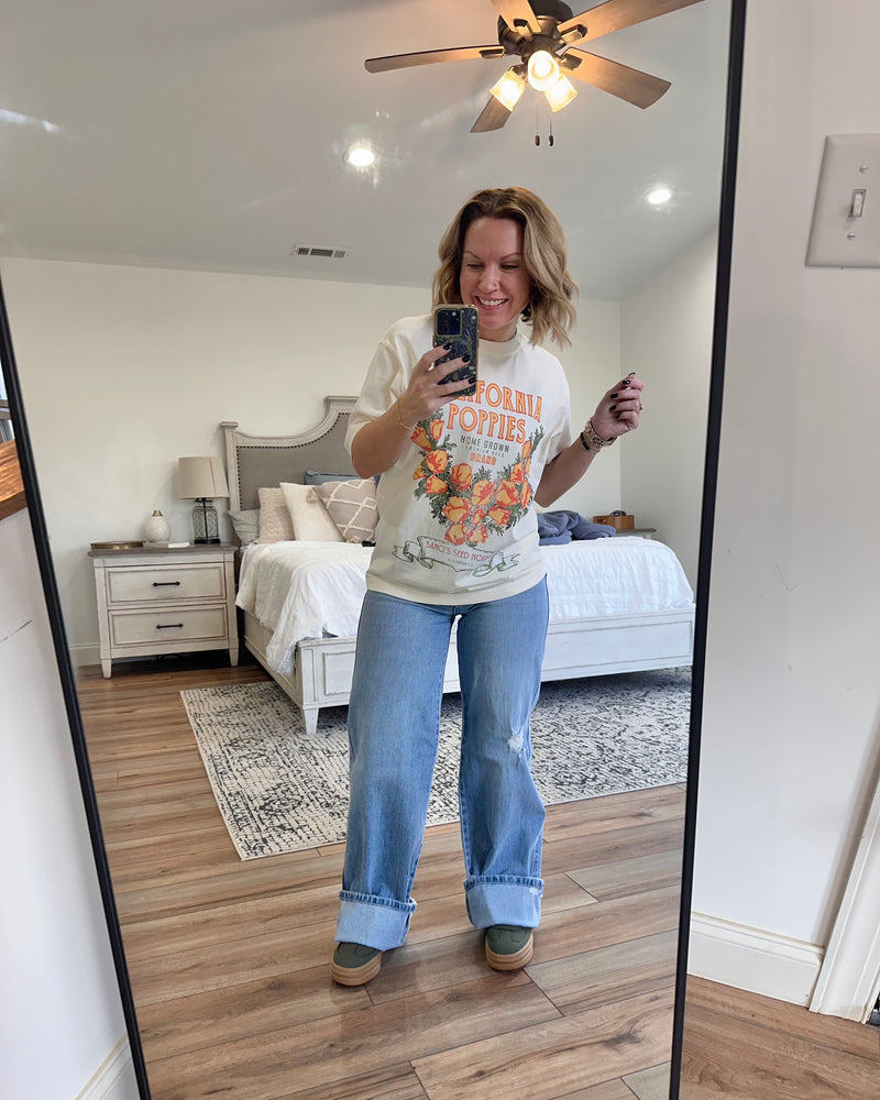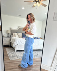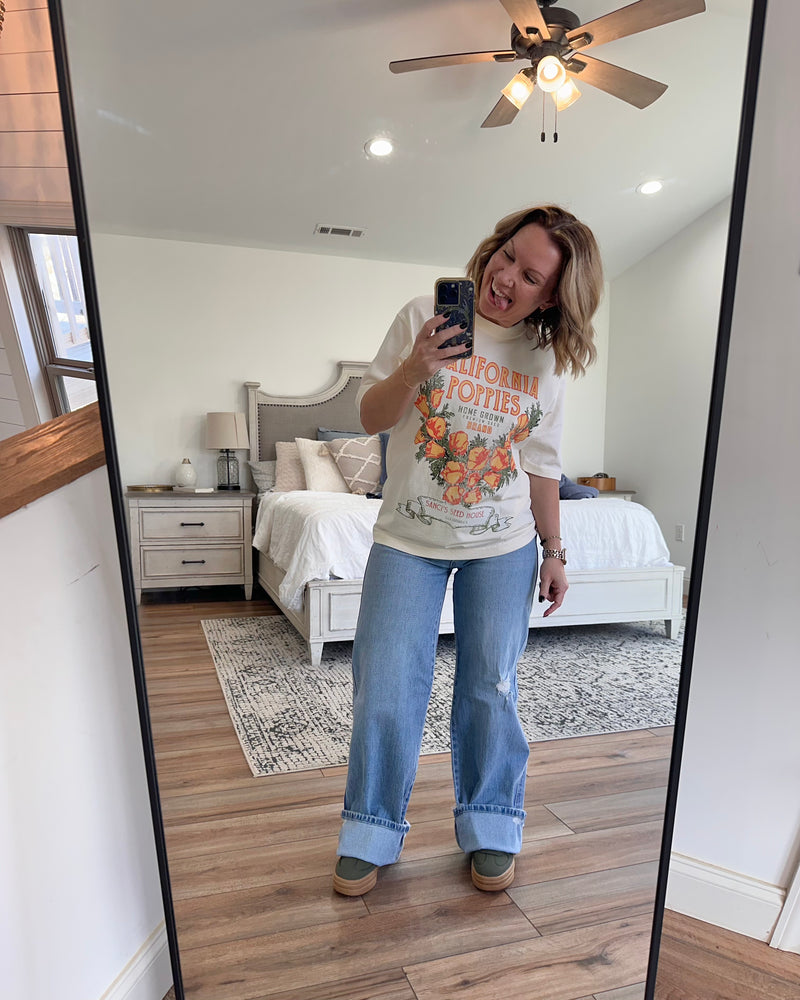 Wide leg denim is all the rage right now and these are spot on! 1% stretch to give a little wiggle room but keeping with that classic oversized cotton look! Also, 34” inseam… Jenn is 5’2” wearing 2” platforms and can still roll… true to size fit! Destiny is 6' tall.